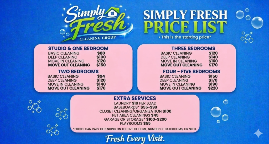 Simply Fresh can help keep your home spotless and comfortable so you can focus on what matters most. Our team will clean living spaces, kitchens, bathrooms, and more. Dust, dirt, and germs reduced and replaced with a clean and beautiful environment for you and your family.